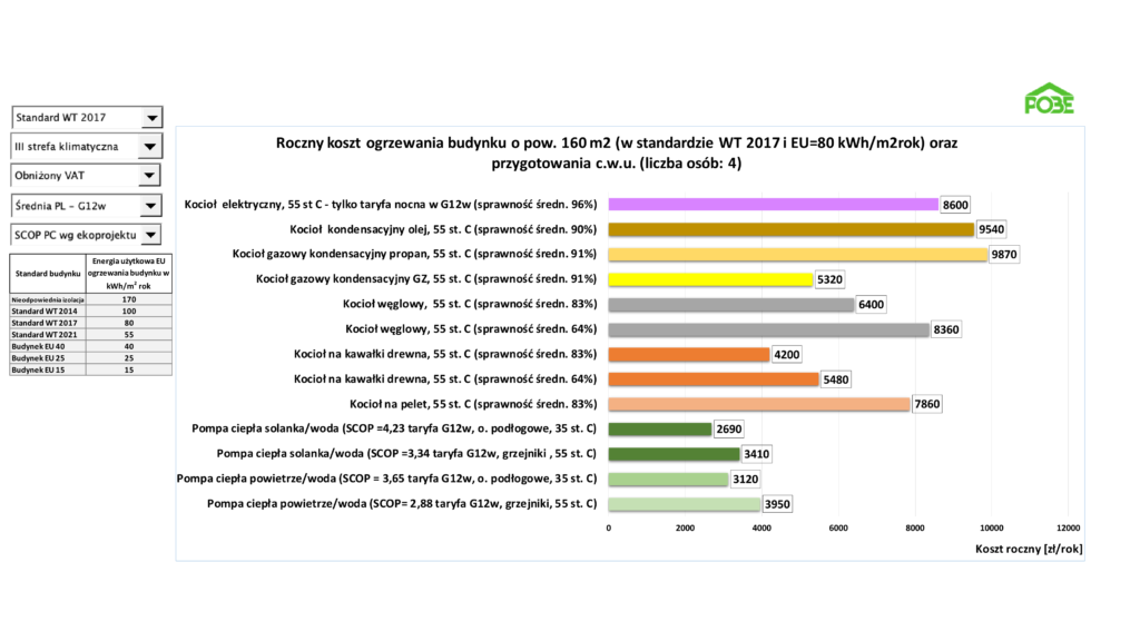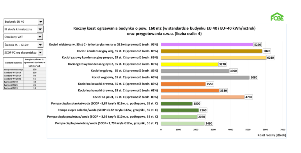 Rys. 2 Przykładowy roczny koszt ogrzewania budynku (poddanego termomodernizacji do standardu WT 2017 – EU 80 kWh/m2rok) o powierzchni ogrzewanej 160 m2, wraz z kosztem przygotowania ciepłej wody użytkowej rodziny 4-osobowej. Dane uwzględniają koszty energii w II kw. 2022 r.