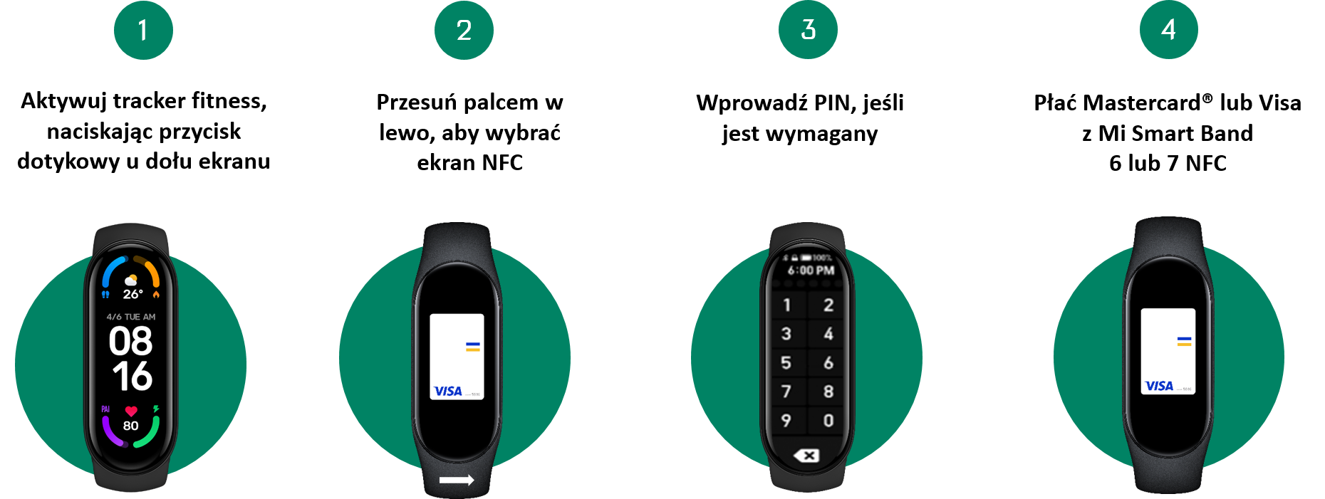 - Korzystaj z szybkich, wygodnych i bezpiecznych płatności zbliżeniowych za pomocą Mi Smart Band i karty Visa lub Mastercard